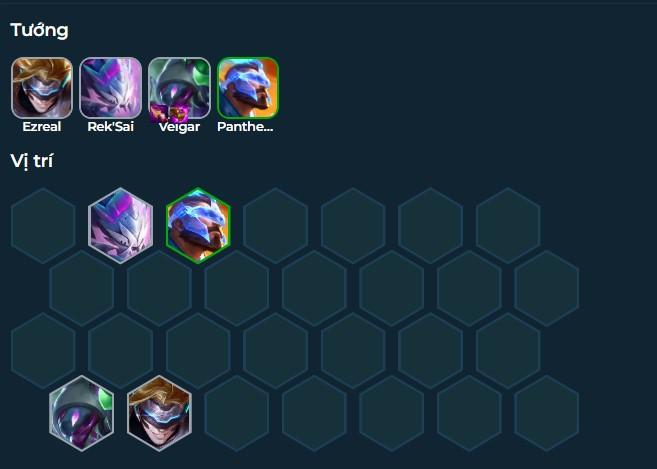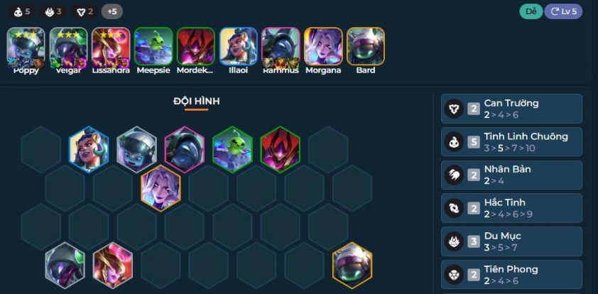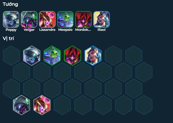 Đây là đội hình chơi xoay quanh Veigar và Lissandra reroll lên 3 sao làm carry, tank sẽ là Poppy và Rammus. Một bài cũng khá ổn có thể rỉa điểm vào top 4 nếu anh em roll ra 3 tướng 1 tiền lên 3 sao sớm.