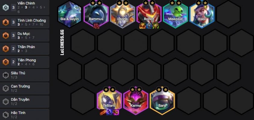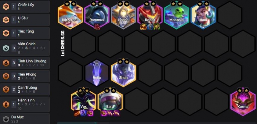 Về trang bị thì đồ core của Vex sẽ là Cuồng Đao, 2 món còn lại flex tùy thế trận với các món AP tùy ý, trong khi đó hàng trên thì Rammus = Robot là các món tank tùy ý bao gồm Vương Miện, Giáp Gai, Giáp Lửa…. Blitzcrank và Shen là các món đấu sĩ hồi máu trong khi đó Bard là đồ năng lượng + crit phép.