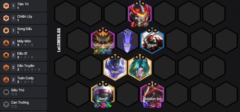 Về trang bị thì chúng ta sẽ tập trung build đồ cho Robot và Aurelion Sol, Robot sẽ có bộ trang bị khá kỳ quái nhưng có tỉ lệ thắng cao nhất là Thú Tượng, Móng Vuốt, Quyền Năng vì nó là đấu sĩ có thiên hướng chống chịu chứ không thuần chống chịu, trong khi đó Aurelion Sol dạng Tối Thượng không cần đồ năng lượng mà sẽ là 3 món AP bất kỳ. Cuối cùng Tahm Kench sẽ là 3 món tank còn Bard hay các 5 vàng khác thì còn đồ gì cũng ghép vào được.