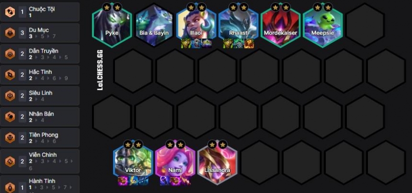 Up lên 7 nhanh nhất có thể và bắt đầu slow roll theo khung Pyke,Illaoi, Rhaast, Mordekaiser, Meepsie và Viktor, Lissandra, ưu tiên Viktor rồi mới đến các Chống Chịu hàng trên. Sau khi 3 sao các 3 vàng rồi chúng ta có thể up lên 8 để thêm Nami làm carry phụ là tròn bài :