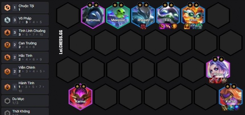 Bộ khung phổ biến nhất hiện tại gồm Fizz, Kai’Sa, Ornn, Rhaast, Karma, Rammus, Gwen và Meepsie, vận hành theo lối slow roll 3 vàng cấp 7. Sau khi up lên cấp 8 thì bổ sung Riven để có thêm sát thương từ Vô Pháp :