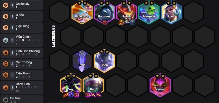 Về trang bị thì đồ chuẩn của Vex sẽ là Cuồng Đao, 2 món còn lại flex tùy thế trận với các món AP tùy ý, trong khi đó hàng trên thì Rammus và Robot là các món tank tùy ý bao gồm Vương Miện, Giáp Gai, Giáp Lửa…. Blitzcrank và Shen là các món đấu sĩ hồi máu trong khi đó Bard là đồ năng lượng và chí mạng phép dư ra hoặc các món hiệu ứng nếu chưa xây dựng.