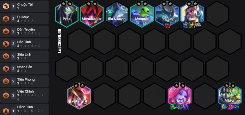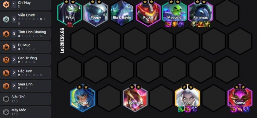 Sau khi có được Lõi này rồi khung đội hình của chúng ta sẽ 6 sẽ bao gồm Meepsie, Pyke, Poppy, Viegar, Lissandra và Aurora. Sau khi có 2 chủ lực 3 sao chúng ta up lên 8 để thay vào đội hình cuối những tướng chất lượng như Sona, Karma, Rammus, Robot :