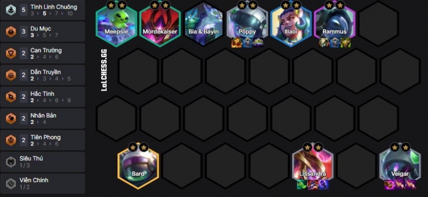 Đây là đội hình chơi xoay quanh Veigar và Lissandra reroll lên 3 sao làm carry, tank chính sẽ là Poppy và Rammus. Một bài đấu khá ổn có thể vào top 4 và thậm chí với một số Lõi bổ trợ như Bài Học Sơ Khai thì hoàn toàn có thể top 1.