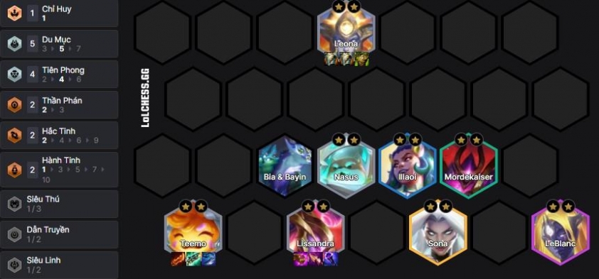 Đây là bài reroll 1 vàng là chủ yếu với mục tiêu dát vàng Teemo và Leona sớm làm tiền đề up cấp để thêm vào các 4-5 vàng mạnh như Sona và Leblanc :