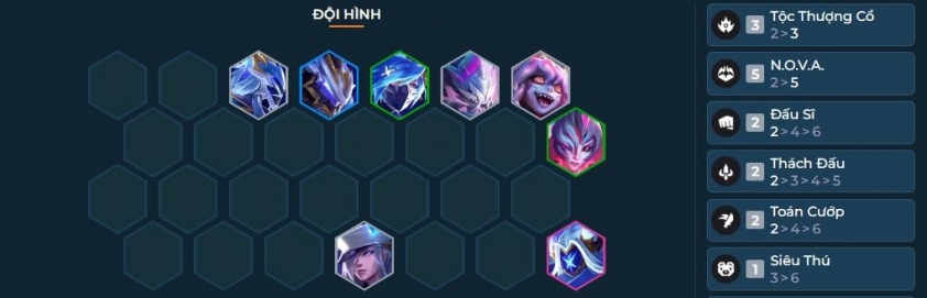 Đây là đội hình chơi xung quanh Tộc Thượng Cổ và NOVA với việc tập chung reroll các tướng 1 tiền như Briar, Caitlyn, Rek’Sai, Akali và Bel’Veth.