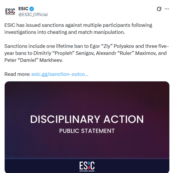 Trong khi đó, Egor "Zly" Polyakov phải nhận án cấm vĩnh viễn khỏi mọi sự kiện do ESIC quản lí. Quyết định này được đưa ra dựa trên mức độ nghiêm trọng của hành vi vi phạm cũng như việc cá nhân này chính thức thừa nhận tội lỗi và chấp nhận án phạt cao nhất.
