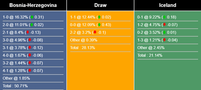 Tỷ số có khả năng nhất cho chiến thắng của Bosnia & Herzegovina là 1-0 với xác suất là 16,32%. Các tỷ số có khả năng xảy ra tiếp theo cho kết quả đó là 2-0 (11,01%) và 2-1 (8,4%). Tỷ số hòa dễ xảy ra nhất là 1-1 (12,44%), trong khi tỷ số nếu Iceland thắng là 0-1 (9,22%).