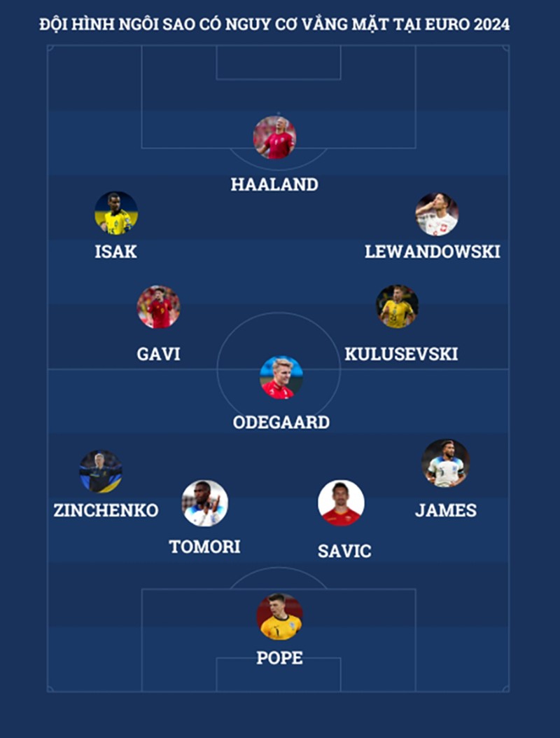 Vòng loại EURO 2024 đã bước vào giai đoạn quyết định. Đã xuất hiện những tên tuổi lớn không thể góp mặt tại ngày hội ở Đức như Haaland hay Odegaard. Bên cạnh đó, nếu không có được kết quả như ý với đội tuyển của mình, những Savic, Evan Ferguson hay Lewandowski đều sẽ phải làm khán giả. Dưới đây là đội hình ngôi sao có nguy cơ lỡ hẹn với Euro mùa hè năm sau.