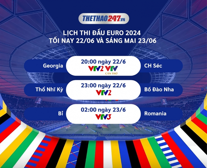 Lịch Euro 2024 tối nay 22/6 diễn ra 2 cặp đấu tại bảng F giữa Georgia vs CH Séc và Thổ Nhĩ Kỳ vs Bồ Đào Nha, vào rạng sáng 23/6 là cặp đấu tại bảng E giữa Bỉ vs Romania.