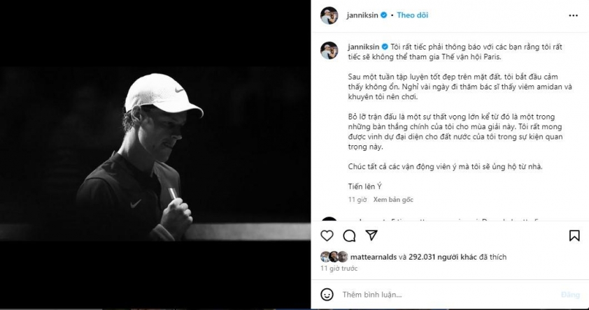 Vắng mặt ở Olympic thực sự là nỗi thất vọng lớn với cá nhân tôi, bởi Thế vận hội là mục tiêu lớn nhất của tôi ở mùa giải năm nay. Tôi đã rất mong được vinh dự đại diện cho đất nước ở sự kiện quan trọng này.", Sinner chia sẻ trên trang Instagram cá nhân.