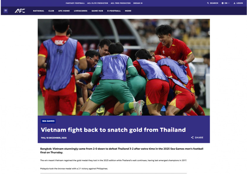 Trên trang chủ, AFC nhấn mạnh việc Việt Nam “stunningly came from 2-0 down”, ngược dòng ngoạn mục, để giành chiến thắng 3-2 sau hiệp phụ, qua đó đoạt tấm Huy chương Vàng danh giá ngay trên sân Rajamangala của đối thủ.