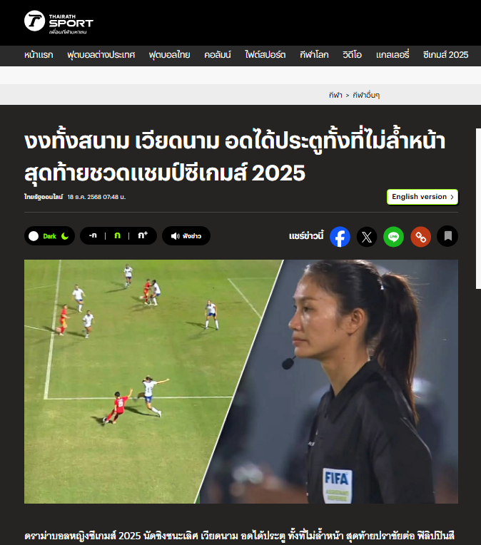 Tờ Thairath (Thái Lan) vừa đưa tin và phân tích chi tiết tình huống gây tranh cãi trong trận chung kết bóng đá nữ SEA Games 2025, nơi đội tuyển Việt Nam bị từ chối một bàn thắng dù không hề rơi vào thế việt vị.