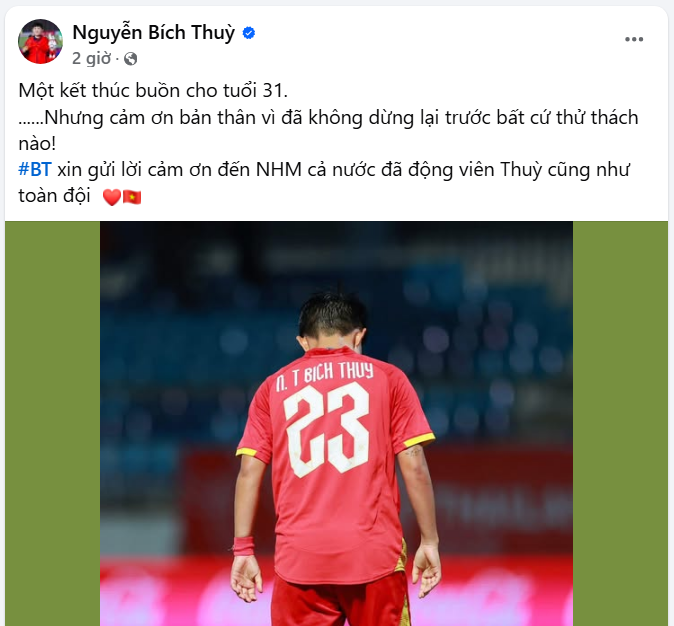 Sáng 18/12, trên trang Facebook cá nhân, Bích Thùy đã chính thức lên tiếng sau trận thua đầy cay đắng. Dòng trạng thái ngắn gọn nhưng chất chứa nhiều cảm xúc của cầu thủ sinh năm 1994 nhanh chóng thu hút sự chú ý lớn từ người hâm mộ: “Một kết thúc buồn cho tuổi 31......Nhưng cảm ơn bản thân vì đã không dừng lại trước bất cứ thử thách nào! #BT xin gửi lời cảm ơn đến NHM cả nước đã động viên Thuỳ cũng như toàn đội.”