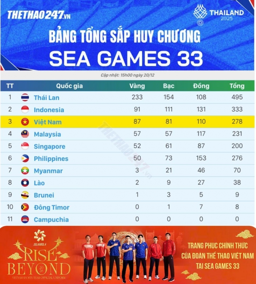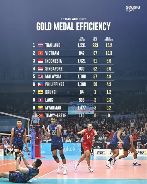 Theo bảng thống kê của Seasia goal, SEA Games 33 không chỉ được nhìn nhận qua số lượng HCV tuyệt đối, mà còn được phân tích dựa trên tỷ lệ HCV trên mỗi VĐV tham dự. Cách tiếp cận này nhanh chóng tạo ra nhiều luồng ý kiến trái chiều, nhất là khi Thái Lan, nước chủ nhà, dù đứng đầu bảng tổng sắp huy chương, lại bị cho là “kém hiệu quả” hơn so với một số đối thủ.