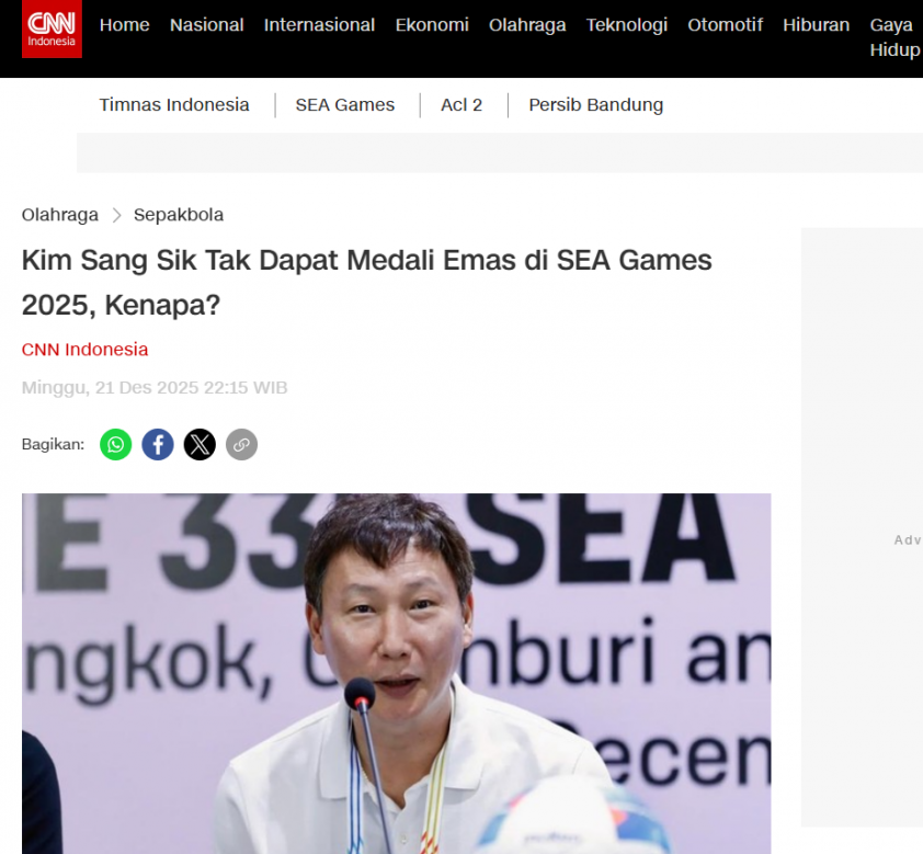 Việc HLV Kim Sang Sik không được trao HCV sau trận chung kết bóng đá nam SEA Games 33 đã trở thành chủ đề gây chú ý không chỉ tại Việt Nam, mà còn thu hút sự quan tâm đặc biệt từ truyền thông Indonesia.