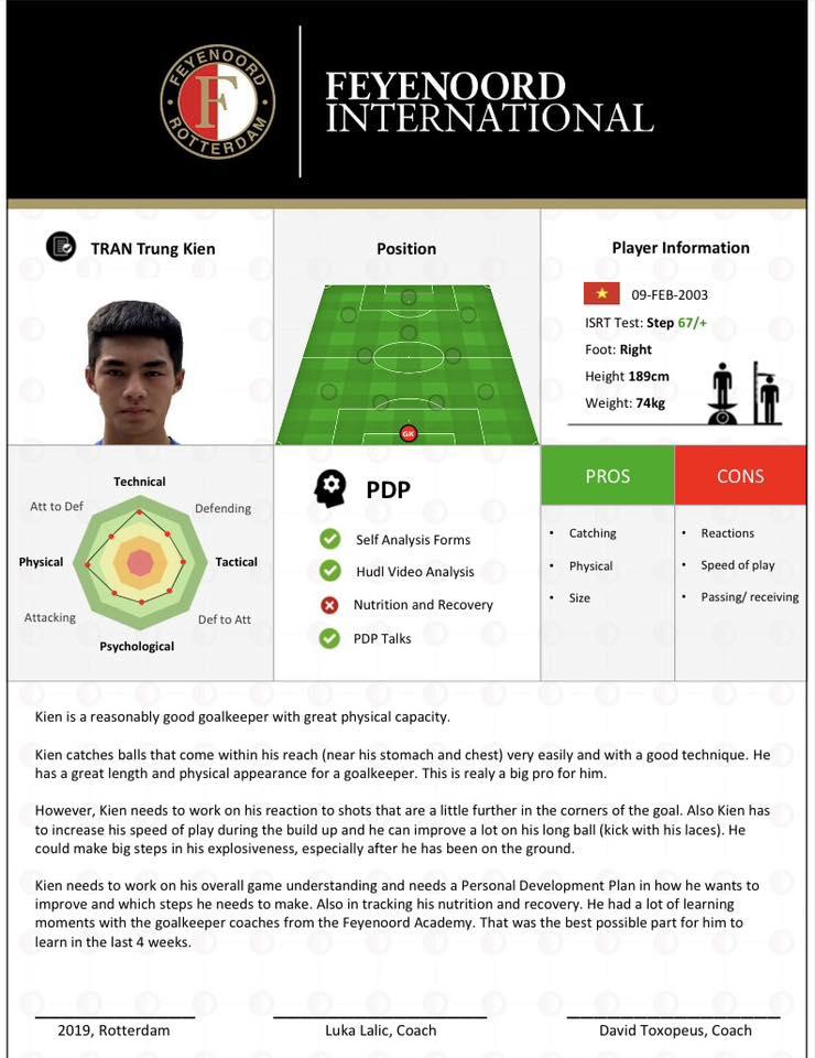 Thủ môn Trần Trung Kiên là một trong những cái tên gây ấn tượng mạnh. Các chuyên gia Hà Lan đánh giá cao thể hình, thể chất và khả năng bắt bóng trong tầm với của anh. Sải tay dài cùng vóc dáng lý tưởng giúp Trung Kiên xử lý chắc chắn các tình huống cơ bản, cho thấy nền tảng phù hợp với yêu cầu của bóng đá hiện đại.
