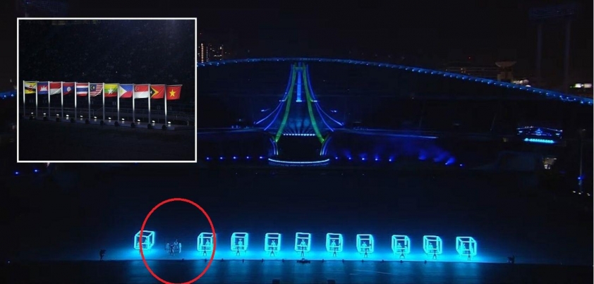 Tuy nhiên, sự cố xảy ra khi trụ sáng hình lập phương thứ hai bất ngờ không phát sáng trong lúc trình diễn. Chi tiết này nhanh chóng lọt vào ống kính truyền hình và được khán giả phát hiện. Điều gây chú ý là Campuchia cũng chính là quốc gia thứ hai trong danh sách ASEAN nếu sắp xếp theo thứ tự bảng chữ cái ABC.