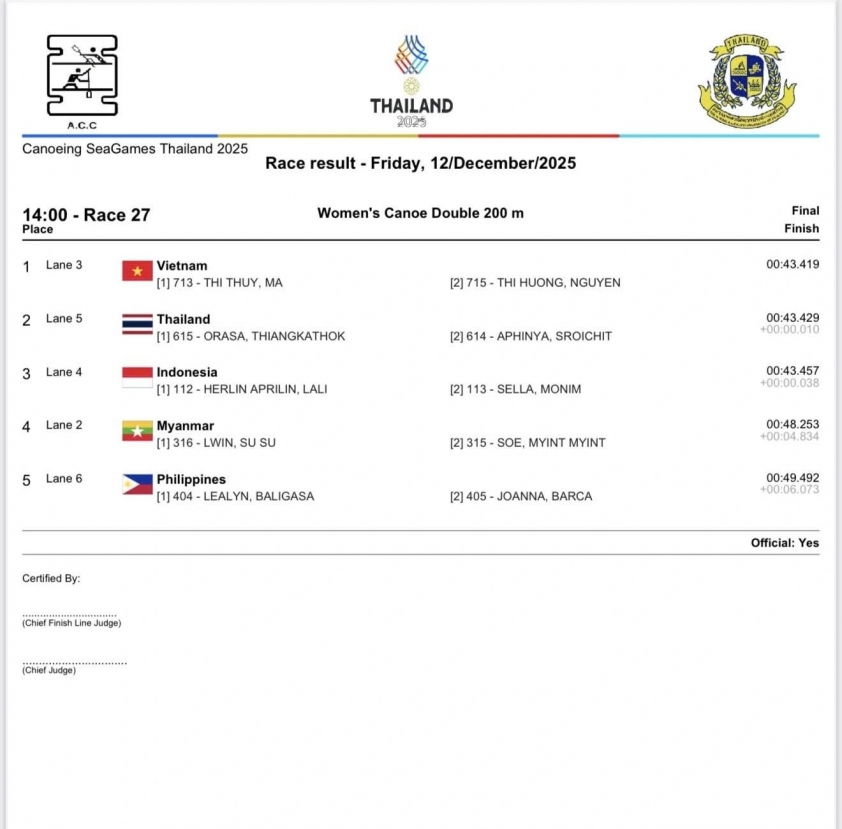 Khoảnh khắc cán đích diễn ra quá sít sao khiến mọi ánh mắt đều dồn về bảng thời gian nhưng con số lại không đủ rõ ràng để khẳng định chiến thắng. Các trọng tài buộc phải dùng ảnh chụp để xác định kết quả cuối cùng. Sau vài phút chờ đợi căng thẳng, thuyền Việt Nam được xác nhận về trước với khoảng cách chỉ 0,01 giây. (43,419 giây so với 43,429 giây)