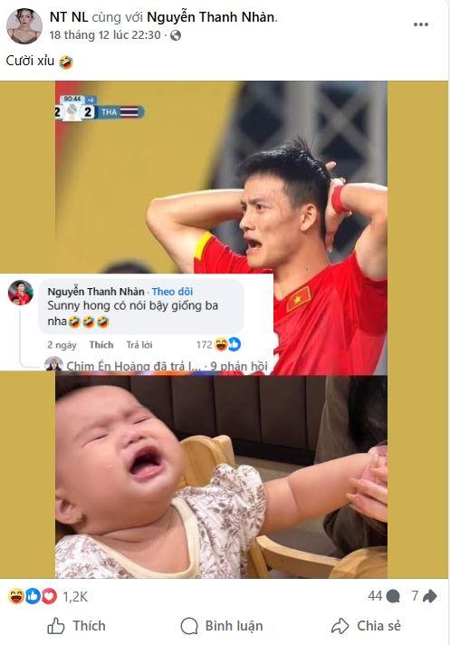 Câu chuyện càng trở nên thú vị khi khuya cùng ngày, Ngọc Lan, bà xã của Thanh Nhàn đã chia sẻ lại bức ảnh viral của chồng. Cô còn ghép khoảnh khắc này với biểu cảm khóc mếu của bé Sunny, con gái đầu lòng của cặp đôi, kèm chú thích ngắn gọn: “Cười xỉu”, khiến cộng đồng mạng thích thú.