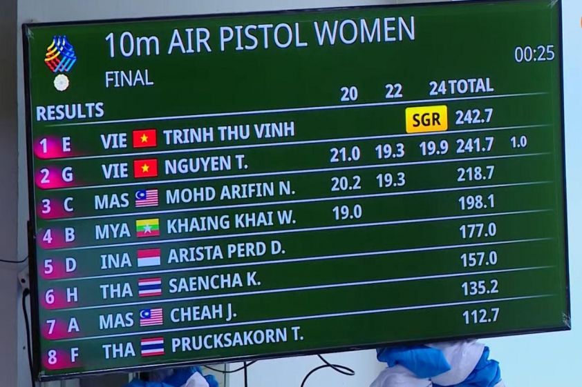 Ở loạt bắn quyết định, Trịnh Thu Vinh cho thấy bản lĩnh và sự ổn định đáng nể. Xạ thủ sinh năm 2000 duy trì nhịp bắn chính xác qua từng lượt, liên tục tạo khoảng cách an toàn với các đối thủ. Chung cuộc, cô đạt 242,7 điểm, chính thức phá kỷ lục SEA Games, qua đó mang về tấm HCV thuyết phục cho đoàn Thể thao Việt Nam.