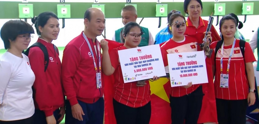 Thành tích ấn tượng của Thu Vinh và Thùy Trang không chỉ được ghi nhận bằng huy chương. Ngay sau khi kết thúc thi đấu, 2 VĐV xuất sắc lần lượt nhận thưởng nóng 10 triệu đồng cho HCV của Thu Vinh và 5 triệu đồng cho HCB của Thùy Trang. Đây là món quà ý nghĩa nhằm kịp thời động viên tinh thần hai xạ thủ xuất sắc.