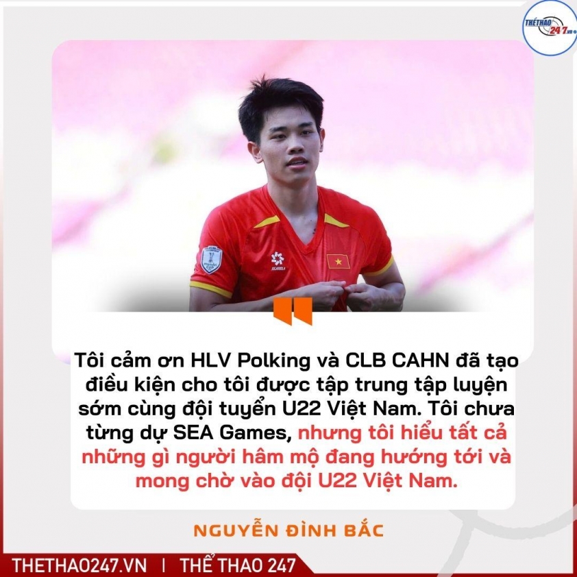 SEA Games 33 trở thành cột mốc cho sự trưởng thành ấy. Trước giải đấu, Đình Bắc chủ động xin CLB CAHN được tập trung sớm cùng U22 Việt Nam, thể hiện khát khao cống hiến hiếm thấy ở một cầu thủ trẻ. Anh trân trọng cơ hội được chuẩn bị dài hơi, xem đây là hành trình cực kỳ quan trọng trong sự nghiệp khoác áo đội tuyển ở sân chơi khu vực.