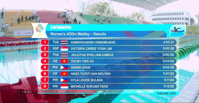 Bên phía nữ, Nguyễn Thúy Hiền mang đến sự yên tâm cho ban huấn luyện khi xếp thứ 6 ở vòng loại 100 m bơi ếch nữ. Kết quả này giúp cô giành quyền vào chung kết, nơi các VĐV sẽ phải đối mặt với những kình ngư rất mạnh đến từ Singapore, Thái Lan và Philippines. Dù vậy, việc giữ được nhịp độ ổn định ở vòng loại được xem là bước chạy đà quan trọng cho màn bứt phá ở lượt bơi quyết định.