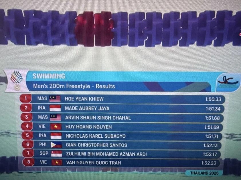 Ở nội dung 200 m tự do nam, Nguyễn Huy Hoàng tiếp tục cho thấy đẳng cấp của một trong những niềm hy vọng lớn nhất của bơi Việt Nam. Anh cán đích ở vị trí thứ 4 tại vòng loại, đủ để giành vé vào chung kết mà không cần bung hết sức. Cùng nội dung này, Trần Văn Nguyễn Quốc cũng hoàn thành phần thi với vị trí thứ 8, qua đó trở thành đại diện thứ hai của Việt Nam góp mặt trong cuộc đua tranh huy chương vào buổi chiều.