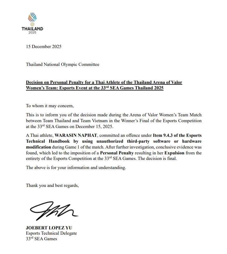 CLB TALON cũng đã ra thông báo đồng ý với quyết định của Trưởng đoàn kỹ thuật đối với nội dung RoV nữ tại SEA Games lần thứ 33, khẳng định bà Naphat Warasin đã vi phạm một quy định quan trọng trong quá trình thi đấu và bị loại khỏi giải. Đồng thời, tư cách vận động viên esports của cô dưới màu áo TALON cũng chính thức bị chấm dứt, có hiệu lực từ ngày 16/12/2025.