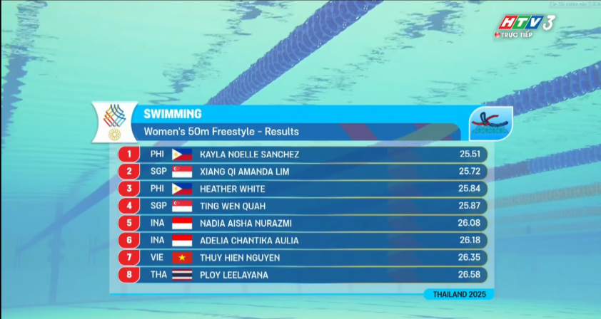 Ở vòng loại nội dung 50m tự do nữ, Việt Nam có 2 đại diện tham dự là Nguyễn Thúy Hiền và Phạm Thị Vân. Sau lượt thi, chỉ có Nguyễn Thúy Hiền giành quyền vào chung kết với thành tích 26 giây 35, xếp thứ 7 ở vòng loại.