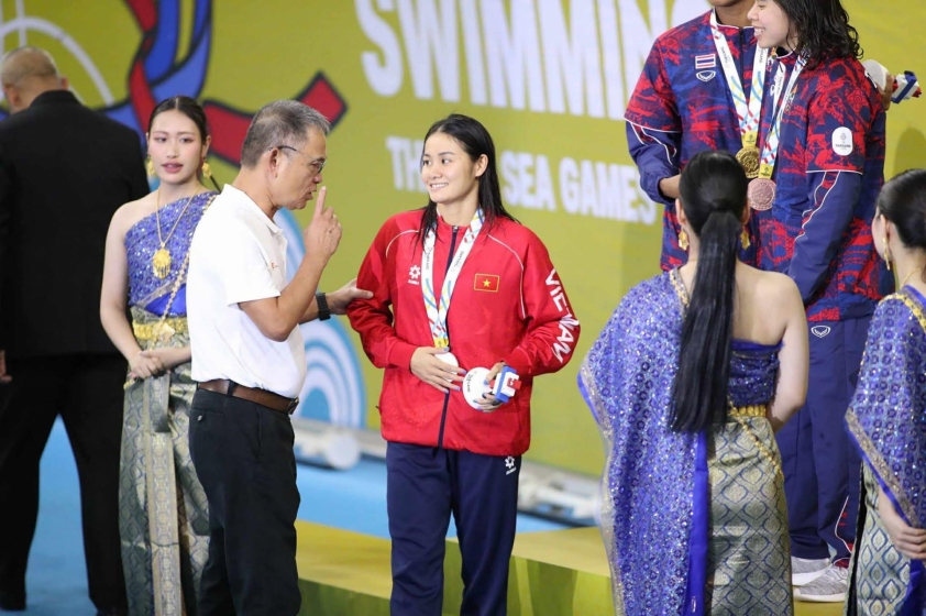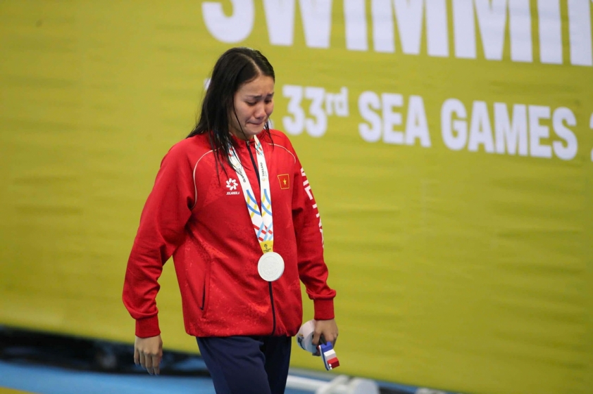 Sau khi giành Huy chương bạc ở nội dung 400m hỗn hợp nữ, kình ngư Võ Thị Mỹ Tiên đã không thể ngăn nổi những giọt nước mắt trong khoảnh khắc trao đổi với lãnh đạo Hiệp hội Thể thao dưới nước Việt Nam.