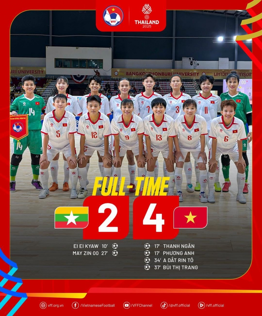 Kết quả bóng đá - ĐT futsal nữ Việt Nam đã xuất sắc lội ngược dòng đánh bại Myanmar, qua đó chính thức giành vé vào bán kết SEA Games 33.