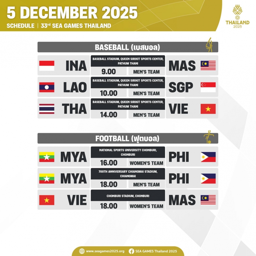 Tại ngày thi đấu hôm 5/12, bộ môn Bóng chày ở nội dung dành cho nam sẽ chính thức khởi tranh tại SEA Games 33. Đoàn thể thao Việt Nam sẽ đối đầu với chủ nhà Thái Lan ở trận đấu muộn nhất diễn ra vào lúc 14h00, trước đó là hai cặp đấu giữa Indonesia vs Malaysia (9h00) và Lào vs Singapore (10h00).