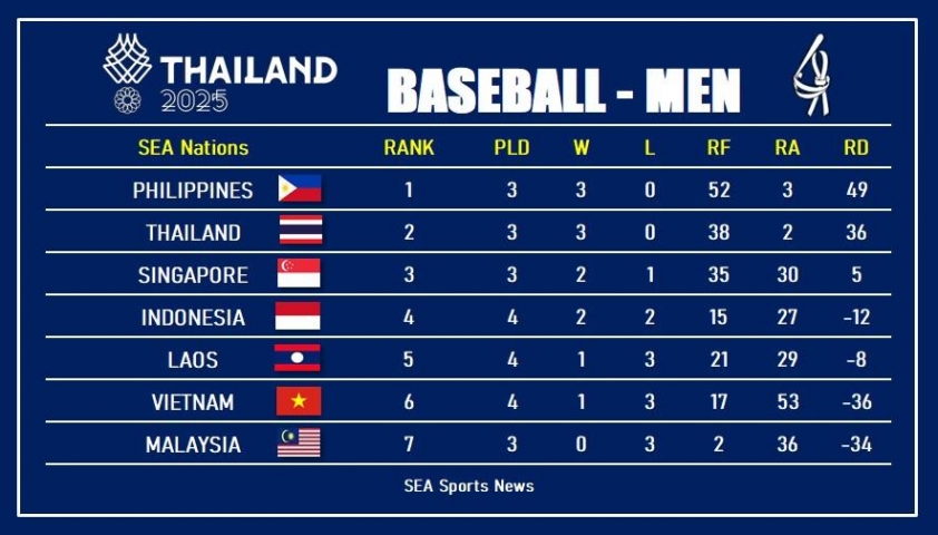 Với chuỗi trận toàn thắng, ĐT bóng chày Philippines cùng chia sẻ ngôi đầu với Thái Lan, đội cũng có thành tích tương tự. Trong khi đó, Malaysia là đội tuyển duy nhất vẫn chưa có được chiến thắng nào trong số 7 đội, khi lần lượt thua Indonesia (0-10), Việt Nam (2-5) và mới nhất là Philippines.