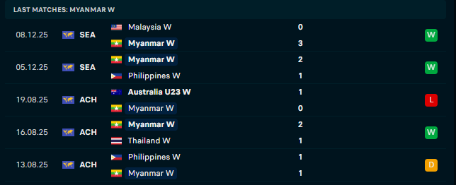 Tại đây, đội trưởng Win Theingi Tun cùng các đồng đội đã hết lần này đến lần khác tạo nên bất ngờ, bao gồm chiến thắng trước Úc tại vòng bảng cũng như đánh bại Thái Lan ở bán kết để bước vào trận đấu cuối cùng. Chính vì vậy, đoàn quân của HLV Tetsuro Uki chắc chắn sẽ đem tới vô vàn khó khăn cho ĐT nữ Việt Nam ở trận đấu tới, nhất là khi họ đang là đương kim vô địch trong 4 lần gần nhất.