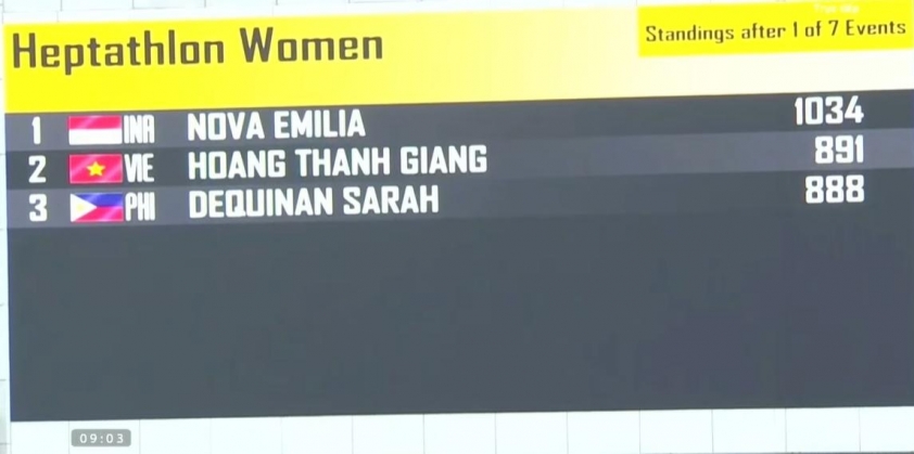 9h04: Hoàng Thanh Giang thi đấu điền kinh 7 môn phối hợp. Cô cán đích thứ 3 ở nội dung 100m vượt rào.