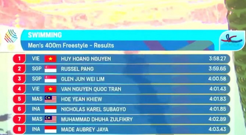 Trần Văn Nguyễn Quốc giành HCB, Nguyễn Huy Hoàng giành HCĐ nội dung 400m tự do nam.