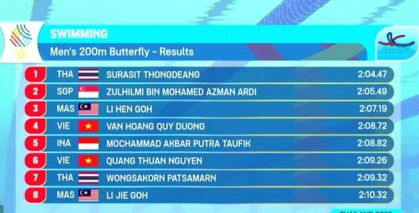 10h10: Bơi lội - Dương Văn Hoàng Quy và Nguyễn Quang Thuấn đều vào chung kết 200m bướm nam