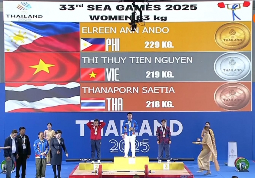 Nguyễn Thị Thủy Tiên mang về tấm HCB thứ 3 trong ngày cho đoàn TTVN ở môn cử tạ, hạng cân 63kg, với tổng cử là 219kg.