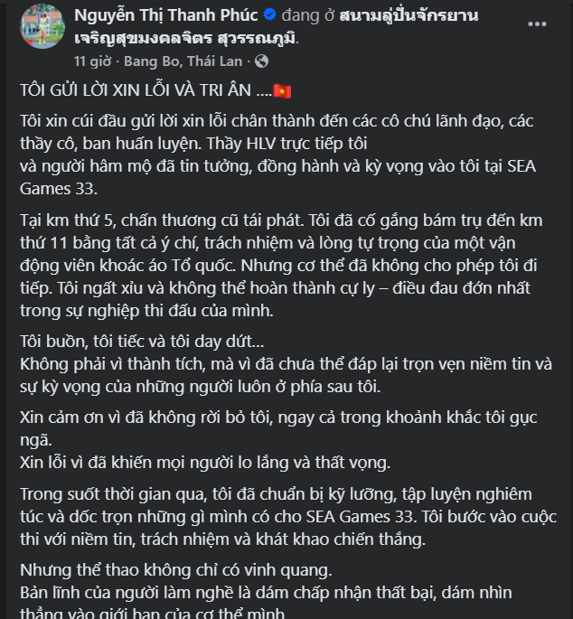 Ở km thứ 5, chân chạy người Đà Nẵng đã bất ngờ tái phát chấn thương, sau đó kiệt sức và không thể tiếp tục phần thi của mình ở km thứ 11. Vận động viên sinh năm 1990 sau đó gửi lời xin lỗi chân thành trên trang Facebook cá nhân, qua đó cho thấy sự đáng tiếc khi buộc phải khép lại hành trình tại SEA Games lần này.