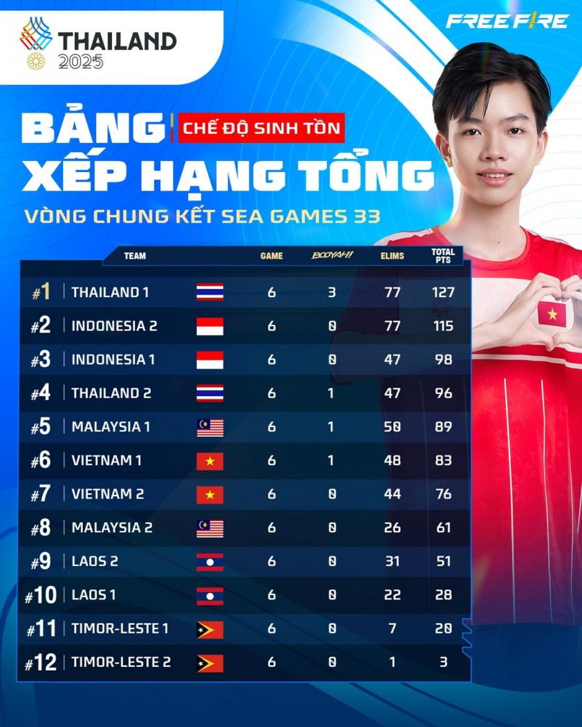 Trong khi đó, Free Fire Thái Lan tiếp tục khẳng định vị thế thống trị tuyệt đối tại SEA Games khi giành được tấm HCV danh giá, trong khi Indonesia xuất sắc ẵm cả HCB lẫn HCĐ. Sự áp đảo này cho thấy khoảng cách về trình độ giữa Việt Nam và các cường quốc Free Fire khu vực vẫn chưa được thu hẹp.