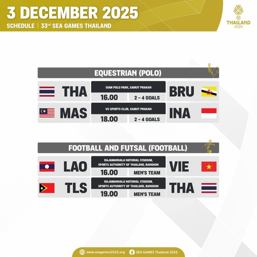 Ngày 3/12 sẽ là ngày thi đấu đầu tiên của SEA Games 33 với 2 môn thi đấu là Polo và bóng đá nam. Đáng chú ý, U22 Việt Nam sẽ có trận ra quân tại bảng B gặp U22 Lào vào lúc 16h00. Trong khi đó, U22 Thái Lan sẽ chạm trán U22 Đông Timor vào lúc 19h00. Cả 2 trận đấu đều được tổ chức tại SVĐ Rajamangala.