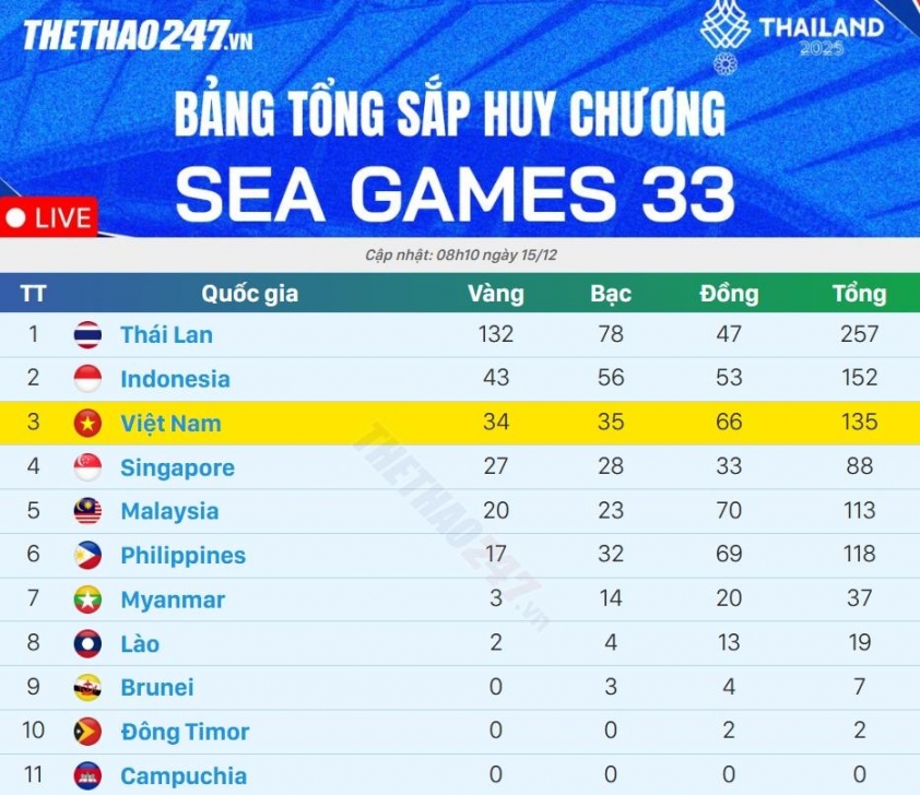 Cụ thể, Đoàn thể thao Việt Nam đang tạm xếp thứ 3 với 34 huy chương vàng, 35 huy chương bạc và 66 huy chương đồng. Trong khi đó, Indonesia đã vươn lên vị trí thứ 2 với thành tích ấn tượng gồm 43 HCV, 56 HCB và 53 HCĐ, qua đó nới rộng khoảng cách đáng kể so với Việt Nam. Dẫn đầu bảng tổng sắp vẫn là chủ nhà Thái Lan, cho thấy sự vượt trội tuyệt đối với 132 HCV, 78 HCB và 47 HCĐ.