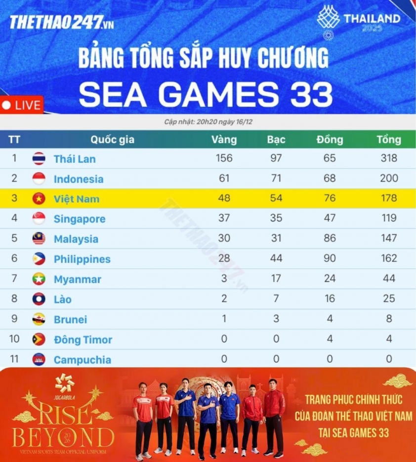Ngày thi đấu 16/12 khép lại với dấu ấn rất đậm nét của Đoàn thể thao Việt Nam khi giành tới 8 HCV, cho thấy sự bứt tốc mạnh mẽ trên bảng tổng sắp SEA Games 33.