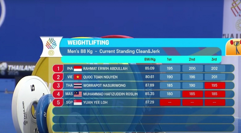 Đô cử Nguyễn Quốc Toàn đã giành HCB ở hạng cân 88kg, sau khi thua VĐV của Indonesia đúng 1kg. Rất đáng tiếc.