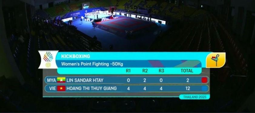 Kickboxing hạng cân 50kg mang về tấm HCV cho Việt Nam sau khi Hoàng Thị Thùy Giang áp đảo võ sĩ Myanmar.