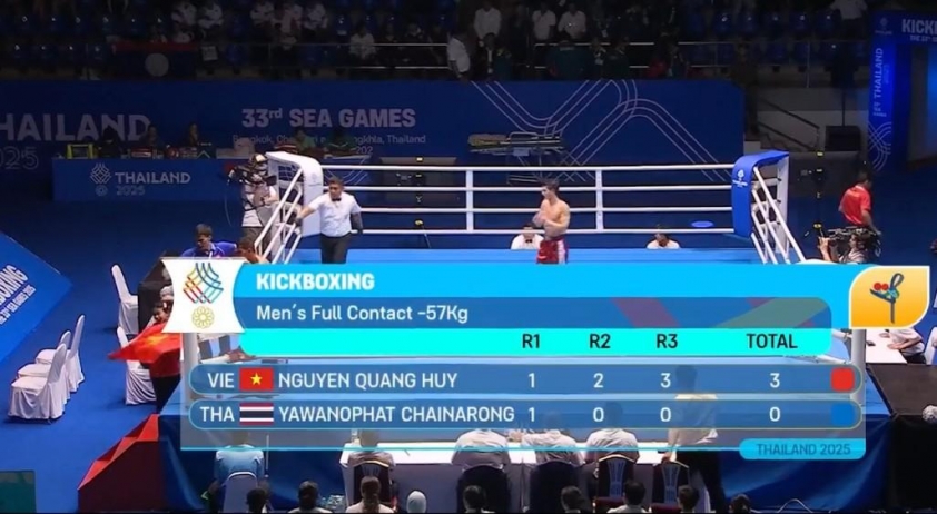 Việt Nam liên tục có HCV vào khung giờ chiều ngày hôm nay! Nguyễn Quang Huy thắng áp đảo võ sĩ Thái Lan để giành tấm HCV ở bộ môn Kickboxing hạng cân Full Contact 57kg.
