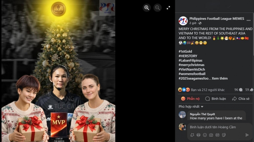 Giữa lúc dư luận vẫn chưa lắng xuống, kênh Philippines Football League MEMES tiếp tục “đổ dầu vào lửa” khi đăng tải một hình ảnh troll tuyển nữ Việt Nam. Bức hình mô tả hai cầu thủ nữ Philippines cầm hộp quà Giáng sinh, đứng giữa là trọng tài biên Phutsavan Chanthavong (người đưa ra quyết định gây tranh cãi) kèm theo huy hiệu MVP (Cầu thủ xuất sắc nhất trận).