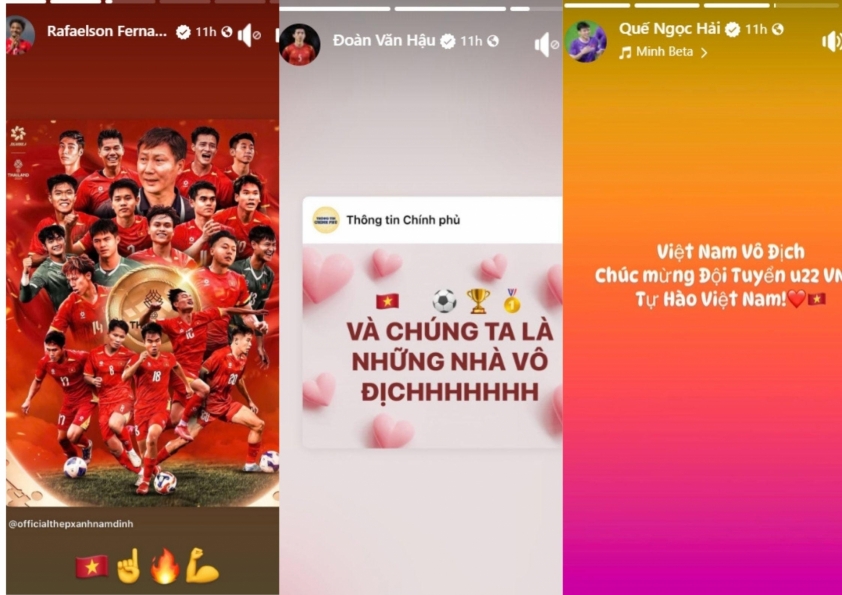 Sau trận đấu, các cầu thủ thế hệ mới của bóng đá Việt Nam nhận về cơn mưa lời chúc mừng, trong đó không thể không nhắc tới những lời khích lệ từ các đàn anh đi trước. Theo đó trên trang cá nhân, các tuyển thủ Quế Ngọc Hải, Quang Hải, Văn Toàn, Đoàn Văn Hậu, Xuân Son... đồng loạt chia sẻ khoảnh khắc đăng quang của thầy trò HLV Kim Sang Sik kèm nhiều lời nhắn cảm xúc.